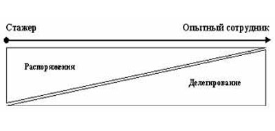 Деятельность новичка по сравнению с опытными «старожилами», нуждается в большем контроле. По отношению к нему руководитель отдает больше распоряжений, чем делегирует полномочий на выполнение заданий. Чем дольше сотрудник работает в компании, тем больше он всего узнает и, как следствие, оптимальными становится делегирование (процесс «взросления» сотрудника изображен на рис.1).